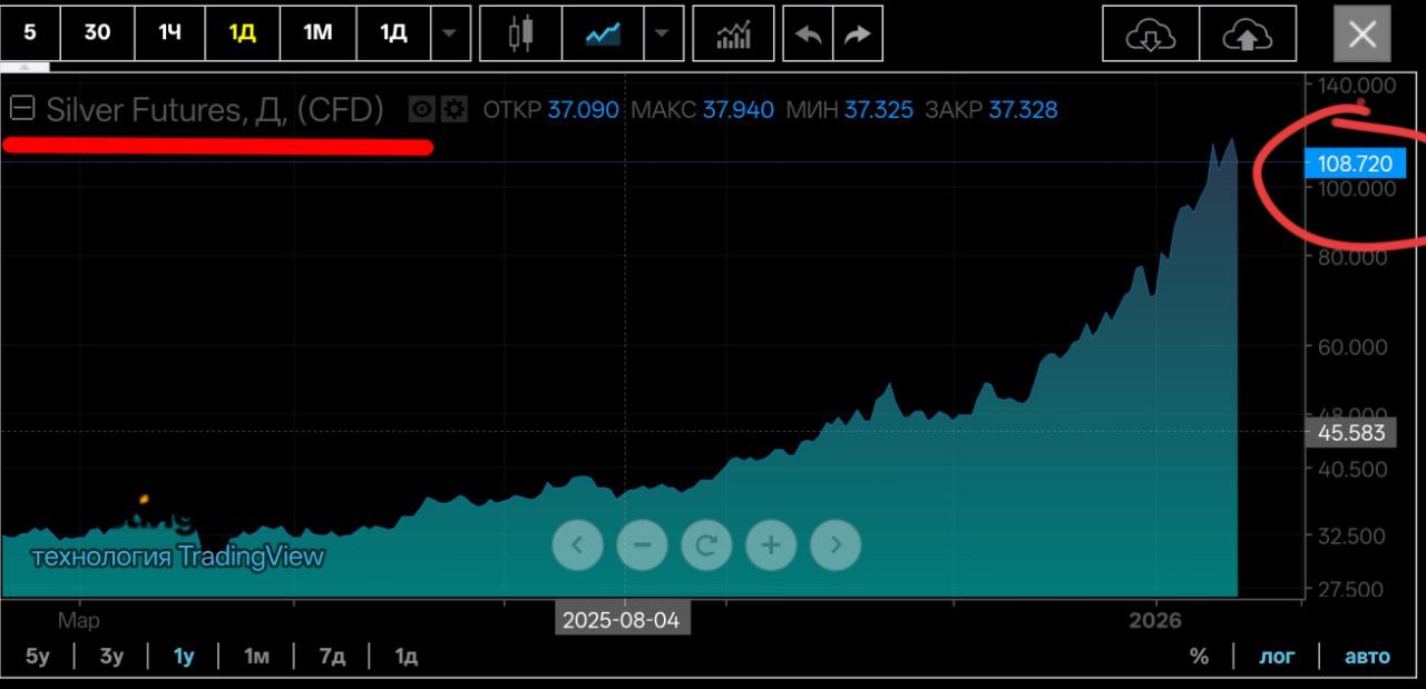 Серебро : за год цена выросла с ~$25 до $108 за унцию. Это рост на 332%.