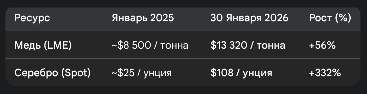 Медь: выросла с ~$8 500 до $13 320 за тонну. Рост на 56%.